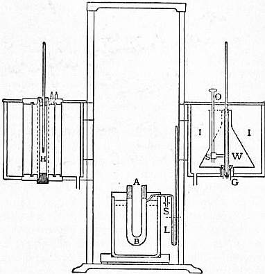 The constant temperature method of mixtures was proposed by N. Hesehus (Jour. Phys., 1888, vii. p. 489). Cold water at a known temperature is added to the calorimeter, immediately after dropping in the heated substance, at such a rate as to keep the temperature of the calorimeter constant, thus eliminating the corrections for the water equivalent of the calorimeter and the external loss of heat. The calorimeter is surrounded by an air-jacket connected to a petroleum gauge which indicates any small change of temperature in the calorimeter, and enables the manipulator to adjust the supply of cold water to compensate it. The apparatus as arranged by F.A. Waterman is shown in fig. 1 (Physical Review, 1896, iv. p. 161). A is the calorimetric tube, B the air-jacket and L the gauge. H is an electric heater for raising the body to a suitable temperature, which can swing into place directly over the calorimeter. W is a conical can containing water cooled by ice I nearly to 0°, which is swung over the calorimeter as soon as the hot body has been introduced and the heater removed. The cold water flow is regulated by a tap S with a long handle O, and its temperature is taken by a delicate thermometer with its bulb at G. The method is interesting, but the manipulations and observations involved are more troublesome than with the ordinary type of calorimeter, and it may be doubted whether any advantage is gained in accuracy.
