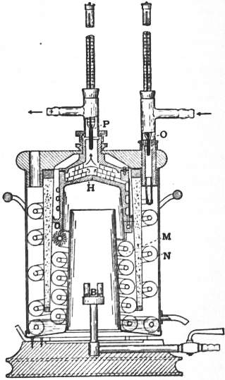 The continuous flow method is specially applicable to the important case of calorific value of gaseous fuel, where a large quantity of heat is continuously generated at a nearly uniform rate by combustion. Fig. 2 illustrates a recent type of gas calorimeter devised by C.V. Boys (Proc. R.S., 1906, A. 77, p. 122). The heated products of combustion from the burner B impinge on a metal box H, through which water is circulating, and then pass downwards and outwards through a spiral cooler which reduces them practically to the atmospheric temperature. A steady stream of water enters the apparatus by the inflow thermometer O, flows through the spiral coolers N and M, and finally through the box H, where it is well mixed before passing the outflow thermometer P. As soon as a steady state is reached, the difference of temperature between the outflow and inflow thermometers, multiplied by the current of water in grammes per minute gives the heat per minute supplied by combustion. The gas current is simultaneously observed by a suitable meter, which, with subsidiary corrections for pressure, temperature, &c., gives the necessary data for deducing calorific value.