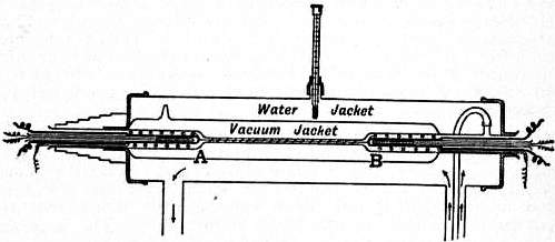 One of the chief difficulties in the practical use of the Bunsen calorimeter is the continued and often irregular movement of the mercury column due to slight differences of temperature, or pressure between the ice in the calorimeter and the ice bath in which it is immersed. C.V. Boys (Phil. Mag., 1887, vol. 24, p. 214) showed that these effects could be very greatly reduced by surrounding the calorimeter with an outer tube, so that the ice inside was separated from the ice outside by an air space which greatly reduces the free passage of heat. The present writer has found that very good results may be obtained by enclosing the calorimeter in a vacuum jacket (as illustrated in fig. 3), which practically eliminates conduction and convection. If the vacuum jacket is silvered inside, radiation also is reduced to such an extent that, if the vacuum is really good, the external ice bath may be dispensed with for the majority of purposes. If the inner bulb is filled with mercury instead of water and ice, the same arrangement answers admirably as a Favre and Silbermann calorimeter, for measuring small quantities of heat by the expansion of the mercury.