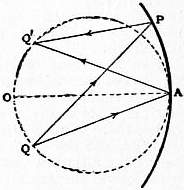 Now as to the phase of the secondary wave, it might appear natural to suppose that it starts from any point Q with the phase of the primary wave, so that on arrival at P, it is retarded by the amount corresponding to QP. But a little consideration will prove that in that case the series of secondary waves could not reconstitute the primary wave. For the aggregate effect of the secondary waves is the half of that of the first Fresnel zone, and it is the central element only of that zone for which the distance to be travelled is equal to r. Let us conceive the zone in question to be divided into infinitesimal rings of equal area. The effects due to each of these rings are equal in amplitude and of phase ranging uniformly over half a complete period. The phase of the resultant is midway between those of the extreme elements, that is to say, a quarter of a period behind that due to the element at the centre of the circle. It is accordingly necessary to suppose that the secondary waves start with a phase one-quarter of a period in advance of that of the primary wave at the surface of resolution.