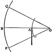 We will now consider in detail the important case in which uniform plane waves are resolved at a surface coincident with a wave-front (OQ). We imagine a wave-front divided into elementary rings or zones—often named after Huygens, but better after Fresnel—by spheres described round P (the point at which the aggregate effect is to be estimated), the first sphere, touching the plane at O, with a radius equal to PO, and the succeeding spheres with radii increasing at each step by ½λ. There are thus marked out a series of circles, whose radii x are given by x² + r² = (r + ½nλ)², or x² = nλr nearly; so that the rings are at first of nearly equal area. Now the effect upon P of each element of the plane is proportional to its area; but it depends also upon the distance from P, and possibly upon the inclination of the secondary ray to the direction of vibration and to the wave-front.