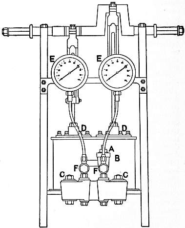 D, Cylinders. E, Pressure gauges. F, Nozzles to which divers’ air pipes are attached. |