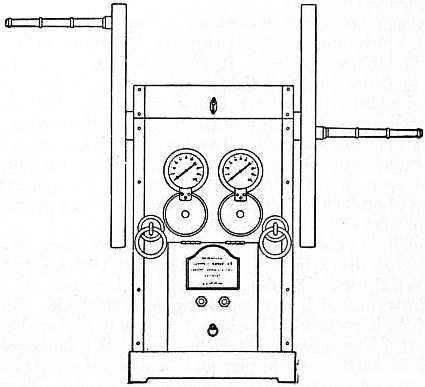 Air Pumps.—The type of air pump varies with the depth of water to which the diver has to descend; it will be readily understood that the greater the depth the greater the quantity of air required by the diver. The pattern most generally in favour amongst divers of all classes is a three-cylinder single-acting pump, which is suitable for almost every description of work which the diver may be called upon to perform, either in deep or shallow water. Another most useful type is a two-cylinder double-acting pump (figs. 1 and 2), which is designed to supply two divers working simultaneously in moderate depths of water, or one diver only in deep water. An air-distributing arrangement is fitted, whereby, when it is desired to send two men down together, each cylinder supplies air independently of the other; and when it is required to send one diver into deep water, the two cylinders are connected and the full volume of air from both is delivered to the one man. The same duty is also performed by a four-cylinder single-acting pump. Smaller pumps, having one double-acting or two single-acting cylinders, are also used for shallow water work.