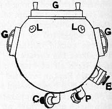 C, Air inlet valve. E, Regulating outlet valve. G, Glasses in frames. L, Eyes to which air pipe and life line are secured. P, Connexion for telephone cable. |