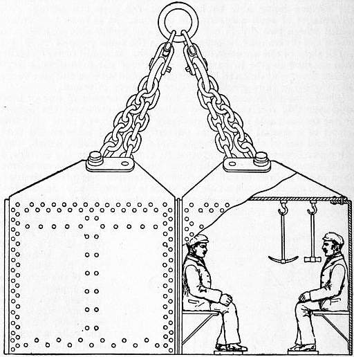 This type of bell was used by John Smeaton in repairing the foundations of Hexham Bridge in 1778, but instead of weighted barrels, he introduced a force pump for supplying the necessary air. To Smeaton too we are indebted for the first diving bell plant in the form with which we are familiar to-day, that celebrated engineer having designed a square bell of iron, for use on the Ramsgate harbour works, in 1788. This bell, which measured 4½ ft. in length, 3 ft. in width and 4½ ft. in height, and weighed 2½ tons, was made sufficiently heavy to sink by its own weight. It afforded room enough for two men to work, and was supplied with air by a force pump worked from a boat at the surface.