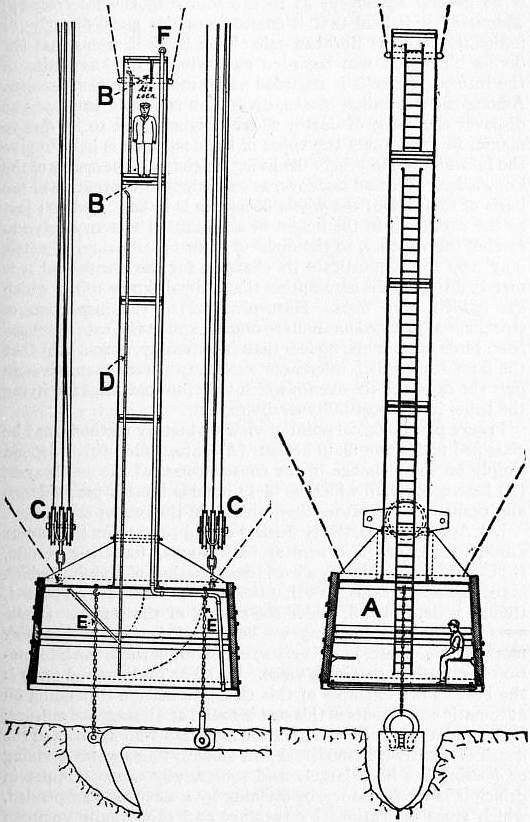 D, Iron ladder. E, Tackles suspended from roof for raising and lowering objects. F, Air supply pipe. |