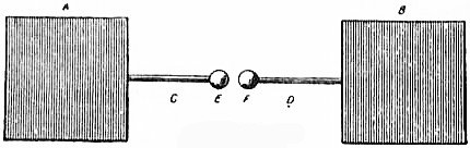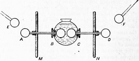 A series of experiments showing the complete analogy between electric and light waves is described by Righi in his book L’Ottica delle oscillazioni elettriche. Righi’s exciter, which is especially convenient when large statical electric machines are used instead of induction coils, is shown in fig. 6. E and F are balls connected with the terminals of the machine, and AB and CD are conductors insulated from each other, the ends B, C, between which the sparks pass, being immersed in vaseline oil. The period of the vibrations given out by the system is adjusted by means of metal plates M and N attached to AB and CD. When the waves are produced by induction coils or by electrical machines the intervals between the emission of different sets of waves occupy by far the largest part of the time. Simon (Wied. Ann., 1898, 64, p. 293; Phys. Zeit., 1901, 2, p. 253), Duddell (Electrician, 1900, 46, p. 269) and Poulsen (Electrotech. Zeits., 1906, 27, p. 1070) reduced these intervals very considerably by using the electric arc to excite the waves, and in this way produced electrical waves possessing great energy. In these methods the terminals between which the arc is passing are connected through coils with self-induction L to the plates of a condenser of capacity C. The arc is not steady, but is continually varying. This is especially the case when it passes through hydrogen. These variations excite vibrations with a period 2π√(LC) in the circuit containing the capacity of the self-induction. By this method Duddell produced waves with a frequency of 40,000. Poulsen, who cooled the terminals of the arc, produced waves with a frequency of 1,000,000, while Stechodro (Ann. der Phys. 27, p. 225) claims to have produced waves with three hundred times this frequency, i.e. having a wave length of about a metre. When the self-induction and capacity are large so that the frequency comes within the limits of the frequency of audible notes, the system gives out a musical note, and the arrangement is often referred to as the singing arc.