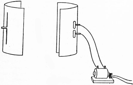 To illustrate the analogy between electric waves and waves of light Hertz found another form of apparatus more convenient. The vibrator consisted of two equal brass cylinders, 12 cm. long and 3 cm. in diameter, placed with their axes coincident, and in the focal line of a large zinc parabolic mirror about 2 m. high, with a focal length of 12.5 cm. The ends of the cylinders nearest each other, between which the sparks passed, were carefully polished. The detector, which was placed in the focal line of an equal parabolic mirror, consisted of two lengths of wire, each having a straight piece about 50 cm. long and a curved piece about 15 cm. long bent round at right angles so as to pass through the back of the mirror. The ends which came through the mirror were connected with a spark micrometer, the sparks being observed from behind the mirror. The mirrors are shown, in fig. 3.