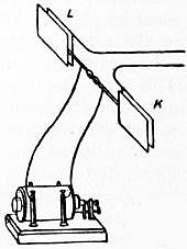 § 5. Stationary Electrical Vibrations.—Hertz (Wied. Ann. 34, p. 609) made his experiments on these in a large room about 15 m. long. The vibrator, which was of the type first described, was placed at one end of the room, its plates being parallel to the wall, at the other end a piece of sheet zinc about 4 m. by 2 m. was placed vertically against the wall. The detector—the circular ring previously described—was held so that its plane was parallel to the metal plates of the vibrator, its centre on the line at right angles to the metal plate bisecting at right angles the spark gap of the vibrator, and with the spark gap of the detector parallel to that of the vibrator. The following effects were observed when the detector was moved about. When it was close up to the zinc plate there were no sparks, but they began to pass feebly as soon as it was moved forward a little way from the plate, and increased rapidly in brightness until it was about 1.8 m. from the plate, when they attained their maximum. When its distance was still further increased they diminished in brightness, and vanished again at a distance of about 4 m. from the plate. When the distance was still further increased they reappeared, attained another maximum, and so on. They thus exhibited a remarkable periodicity similar to that which occurs when stationary vibrations are produced by the interference of direct waves with those reflected from a surface placed at right angles to the direction of propagation. Similar periodic alterations in the spark were observed by Hertz when the waves, instead of passing freely through the air and being reflected by a metal plate at the end of the room, were led along wires, as in the arrangement shown in fig. 4. L and K are metal plates placed parallel to the plates of the vibrator, long parallel wires being attached to act as guides to the waves which were reflected from the isolated end. (Hertz used only one plate and one wire, but the double set of plates and wires introduced by Sarasin and De la Rive make the results more definite.) In this case the detector is best placed so that its plane is at right angles to the wires, while the air space is parallel to the plane containing the wires. The sparks instead of vanishing when the detector is at the far end of the wire are a maximum in this position, but wax and wane periodically as the detector is moved along the wires. The most obvious interpretation of these experiments was the one given by Hertz—that there was interference between the direct waves given out by the vibrator and those reflected either from the plate or from the ends of the wire, this interference giving rise to stationary waves. The places where the electric force was a maximum were the places where the sparks were brightest, and the places where the electric force was zero were the places where the sparks vanished. On this explanation the distance between two consecutive places where the sparks vanished would be half the wave length of the waves given out by the vibrator.