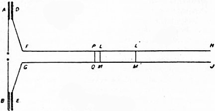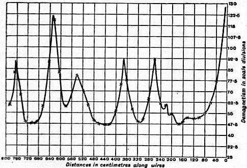 § 9. Waves in Wires.—Many problems on electric waves along wires can readily be investigated by a method due to Lecher (Wied. Ann. 41, p. 850), and known as Lecher’s bridge, which furnishes us with a means of dealing with waves of a definite and determinable wave-length. In this arrangement (fig. 7) two large plates A and B are, as in Hertz’s exciter, connected with the terminals of an induction coil; opposite these and insulated from them are two smaller plates D, E, to which long parallel wires DFH, EGJ are attached. These wires are bridged across by a wire LM, and their farther ends H, J, may be insulated, or connected together, or with the plates of a condenser. To detect the waves in the circuit beyond the bridge, Lecher used an exhausted tube placed across the wires, and Rubens a bolometer, but Rutherford’s detector is the most convenient and accurate. If this detector is placed in a fixed position at the end of the circuit, it is found that the deflections of this detector depend greatly upon the position of the bridge LM, rising rapidly to a maximum for some positions, and falling rapidly away when the bridge is displaced. As the bridge is moved from the coil end towards the detector the deflections show periodic variations, such as are represented in fig. 8 when the ordinates represent the deflections of the detector and the abscissae the distance of the bridge from the ends D, E. The maximum deflections of the detector correspond to the positions in which the two circuits DFLMGE, HLMJ (in which the vibrations are but slightly damped) are in resonance. For since the self-induction and resistance of the bridge LM is very small compared with that of the circuit beyond, it follows from the theory of circuits in parallel that only a small part of the current will in general flow round the longer circuit; it is only when the two circuits DFLMGE, HLMJ are in resonance that a considerable current will flow round the latter. Hence when we get a maximum effect in the detector we know that the waves we are dealing with are those corresponding to the free periods of the system HLMJ, so that if we know the free periods of this circuit we know the wave length of the electric waves under consideration. Thus if the ends of the wires H, J are free and have no capacity, the current along them must vanish at H and J, which must be in opposite electric condition. Hence half the wave length must be an odd submultiple of the length of the circuit HLMJ. If H and J are connected together the wave length must be a submultiple of the length of this circuit. When the capacity at the ends is appreciable the wave length of the circuit is determined by a somewhat complex expression. To facilitate the determination of the wave length in such cases, Lecher introduced a second bridge L′M′, and moved this about until the deflection of the detector was a maximum; when this occurs the wave length is one of those corresponding to the closed circuit LMM′L′, and must therefore be a submultiple of the length of the circuit. Lecher showed that if instead of using a single wire LM to form the bridge, he used two parallel wires PQ, LM, placed close together, the currents in the further circuit were hardly appreciably diminished when the main wires were cut between PL and QM. Blondlot used a modification of this apparatus better suited for the production of short waves. In his form (fig. 9) the exciter consists of two semicircular arms connected with the terminals of an induction coil, and the long wires, instead of being connected with the small plates, form a circuit round the exciter.