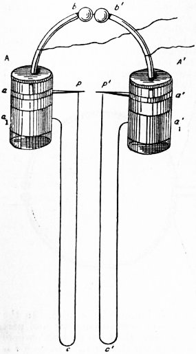 § 10. Velocity of Propagation of Electromagnetic Effects through Air.—The experiments of Sarasin and De la Rive already described (see § 5) have shown that, as theory requires, the velocity of propagation of electric effects through air is the same as along wires. The same result had been arrived at by J.J. Thomson, although from the method he used greater differences between the velocities might have escaped detection than was possible by Sarasin and De la Rive’s method. The velocity of waves along wires has been directly determined by Blondlot by two different methods. In the first the detector consisted of two parallel plates about 6 cm. in diameter placed a fraction of a millimetre apart, and forming a condenser whose capacity C was determined in electromagnetic measure by Maxwell’s method. The plates were connected by a rectangular circuit whose self-induction L was calculated from the dimensions of the rectangle and the size of the wire. The time of vibration T is equal to 2π√(LC). (The wave length corresponding to this time is long compared with the length of the circuit, so that the use of this formula is legitimate.) This detector is placed between two parallel wires, and the waves produced by the exciter are reflected from a movable bridge. When this bridge is placed just beyond the detector vigorous sparks are observed, but as the bridge is pushed away a place is reached where the sparks disappear; this place is distance 2/λ from the detector, when λ is the wave length of the vibration given out by the detector. The sparks again disappear when the distance of the bridge from the detector is 3λ/4. Thus by measuring the distance between two consecutive positions of the bridge at which the sparks disappear λ can be determined, and v, the velocity of propagation, is equal to λ/T. As the means of a number of experiments Blondlot found v to be 3.02 × 1010 cm./sec., which, within the errors of experiment, is equal to 3 × 1010 cm./sec., the velocity of light. A second method used by Blondlot, and one which does not involve the calculation of the period, is as follows:—A and A′ (fig. 10) are two equal Leyden jars coated inside and outside with tin-foil. The outer coatings form two separate rings a, a1; a′, a′1, and the inner coatings are connected with the poles of the induction coil by means of the metal pieces b, b′. The sharply pointed conductors p and p′, the points of which are about ½ mm. apart, are connected with the rings of the tin-foil a and a′, and two long copper wires pca1, p′c′a′1, 1029 cm. long, connect these points with the other rings a1, a1′. The rings aa′, a1a1′, are connected by wet strings so as to charge up the jars. When a spark passes between b and b′, a spark at once passes between pp′, and this is followed by another spark when the waves travelling by the paths a1cp, a′1c′p′ reach p and p′. The time between the passage of these sparks, which is the time taken by the waves to travel 1029 cm., was observed by means of a rotating mirror, and the velocity measured in 15 experiments varied between 2.92 × 1010 and 3.03 × 1010 cm./sec., thus agreeing well with that deduced by the preceding method. Other determinations of the velocity of electromagnetic propagation have been made by Lodge and Glazebrook, and by Saunders.